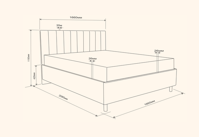 Кровать с велюровым изголовьем с высотой от пола 1105 мм. создаст уютную атмосферу. Высота от пола до верха царг -420 мм. Просвет над полом 120 мм.(Высота деревянных опор150мм.) Комфортно для уборки, в том числе для робота-пылесоса.Мощные царги высотой 300 мм гарантируют максимальную устойчивость, отсутствие скрипов и долговечность даже при активной эксплуатации.